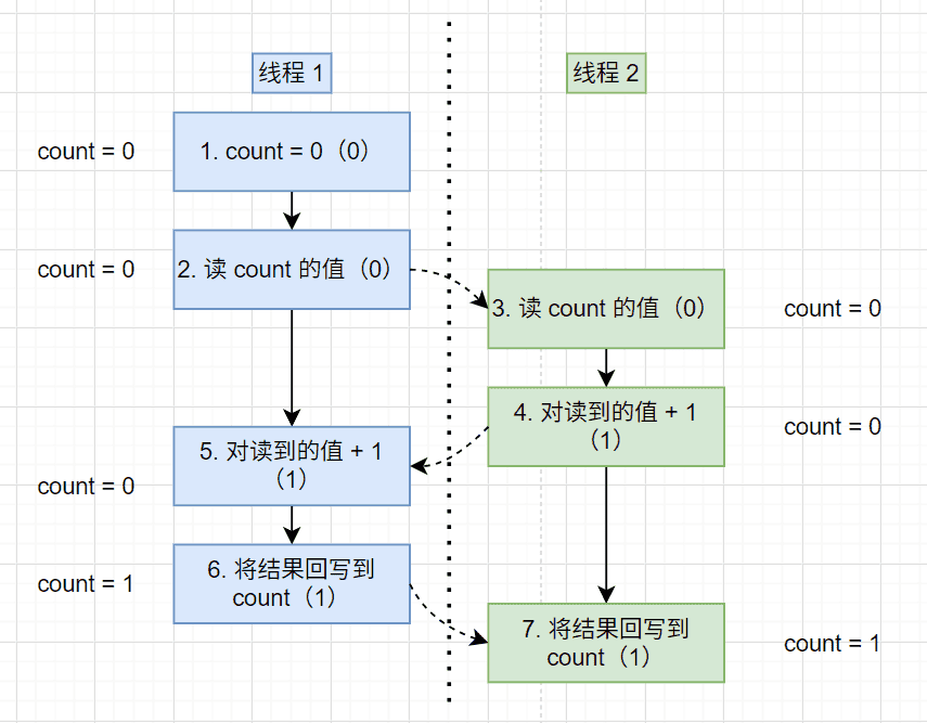 对于上面的三条指令来说,如果线程 1 在 1 执行完后做线程切换,线程 1 和线程 2 按照下图的序列执行,那么我们会发现两个线程都执行了 count+=1 的操作,但是得到的结果不是我们期望的 2,而是 1。