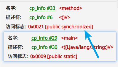 进入和退出 Monitor 通过 monitorenter 和 monitorexit 指令实现。不过标注在方法上的是通过访问标志(flags)实现的,JVM 在进入存在 ACC_SYNCHRONIZED 访问标志的方法时会同进入 monitorenter 一样操作,退出时同理。
